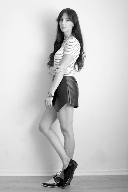 I pretty much wore a lot of my basics today. This faux leather wrap skirt can be paired with anything, and thus is a staple of mine. I don't wear minis but this one has enough attitude to make an exception. The knit striped t-shirt is a newer purchase and I have found myself in it once a week for sure. It's so comfortable and light and can be layered and worn with denim, leather leggings, trousers, you name it. What better pairing than with my Zara loafers?